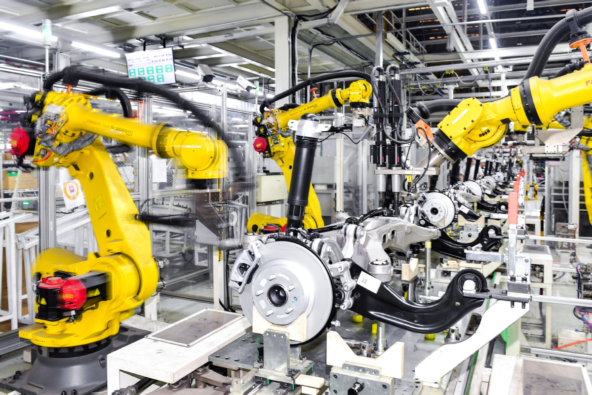 Robot arms in use on the production line of a new energy vehicle maker in Changchun, Jilin province. XU CHANG/XINHUA